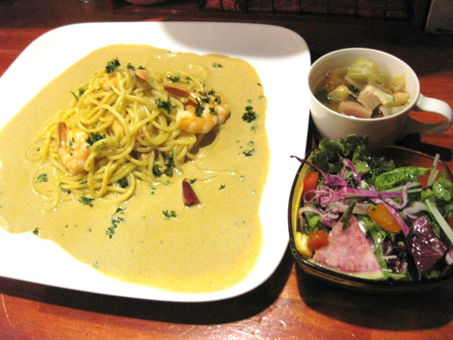 台風の大雨の平日の13時過ぎなのに若い女子でいっぱいの店内だった。たまたまお値引中でお得で大満足。お一人様ランチでもカウンターもあってよかった。ランチについているスープもサラダも新鮮な野菜がカラフルで、いろいろな種類がたっぷり入っていて女子に人気があるわけです。一番人気はなんですか?とスタッフに尋ねたら、女子に大人気はエビのクリームパスタということでこれをいただいた。この日は1300円でした。