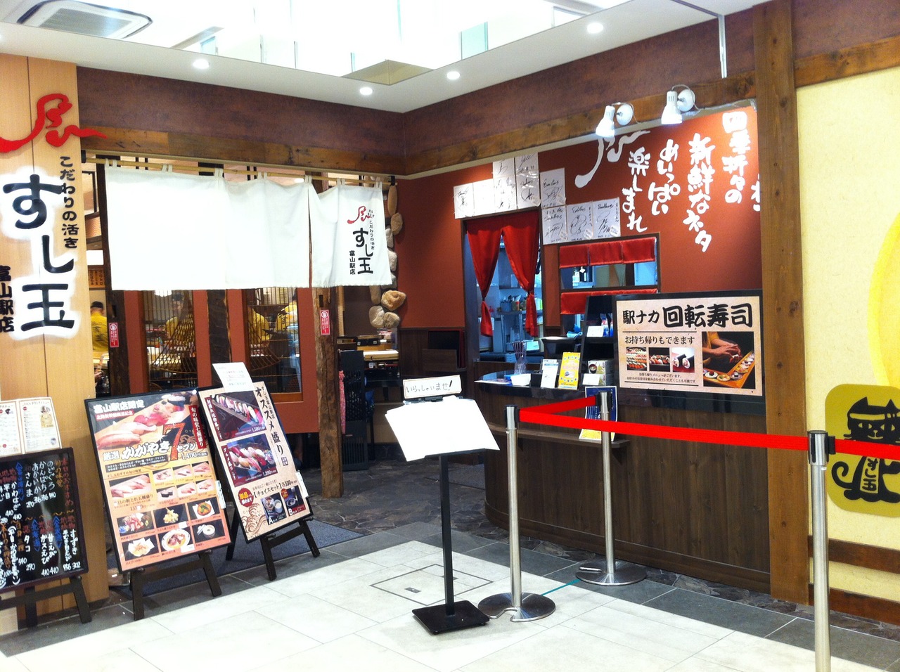 富山の回転ずしのレベルはかなり高いのですが、そのなかでも一番といわれるすし玉の富山駅店です。駅直結のとやマルシェの一階の一角にあり誰もがわかりやすいとおもいます。店内はカウンターとボックス席があり、いろいろな客層に対応していると思いました。お味はネタが新鮮で間違いないです。単品は2貫ずつですが、いろいろ試したい方は3種盛りやセットものをオーダーするといいと思いました。