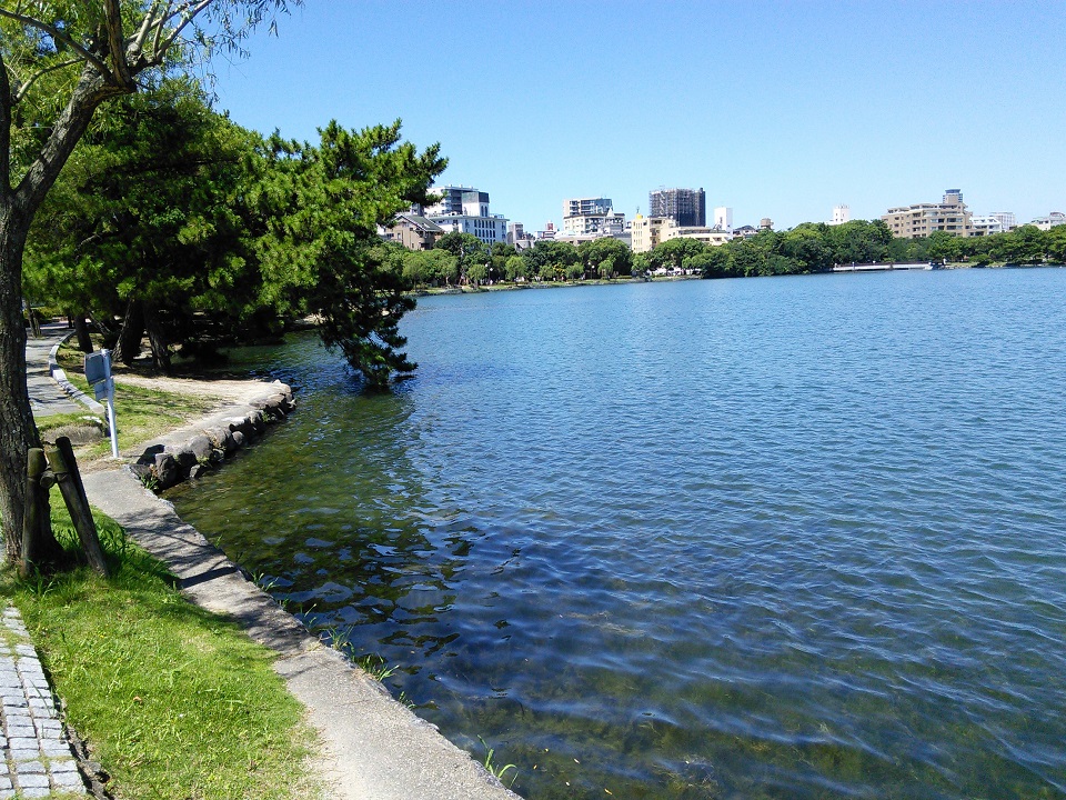 福岡城跡の舞鶴公園に隣接した大きな池の周囲の緑地でございます。
