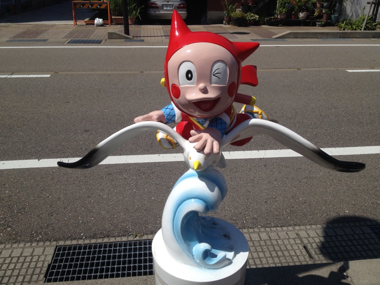 昼食にしようと立ち寄りましたが、日曜日午後だというのに商店街を歩いている人は皆無というぐらいでした、食事をしようにもお店もありませんでした。歩道にはハットリ君のキャラクターの像がちらほらとこちらに関しては良かったです。