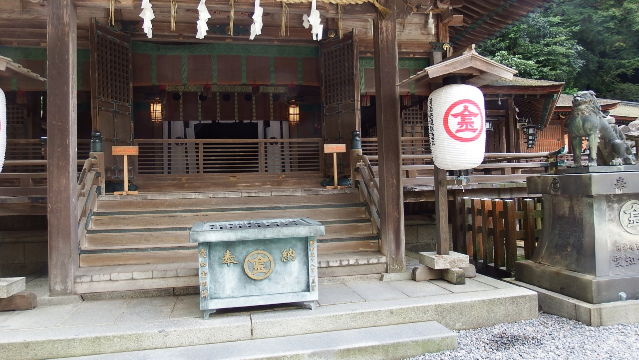 御本宮を左折して南渡殿という長い廊下を右手に追っていくと、間もなく三穂津姫社に行き着く。三穂津姫というのは、御本宮の祭神であるオオモノヌシがパパであり、その娘さんである。本殿や拝殿は桧皮葺。5月10日に例祭がある。