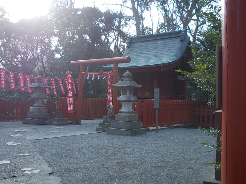 鶴岡八幡宮の本殿横に木々に囲まれた小高い丘があってそこにある丸山稲荷なんですけども赤い幟旗と鳥居があるだけの小さな祠ですね。本殿や宝物殿を見た観光客はだれも見向きもしないので参拝していたのは私達だけでしたよ。