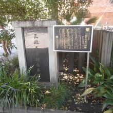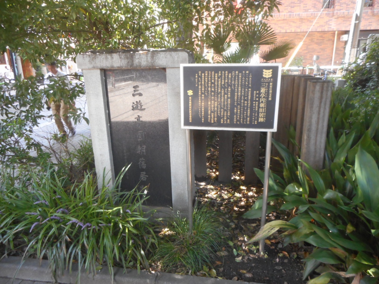 公園の入口のところには、三遊亭円朝旧居跡と書かれた立札と石碑があります。
