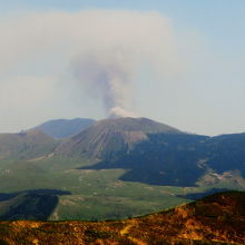 根子岳のギザギザが顔に見え、おへそあたりの中岳からは煙が上がっているのが分かります。