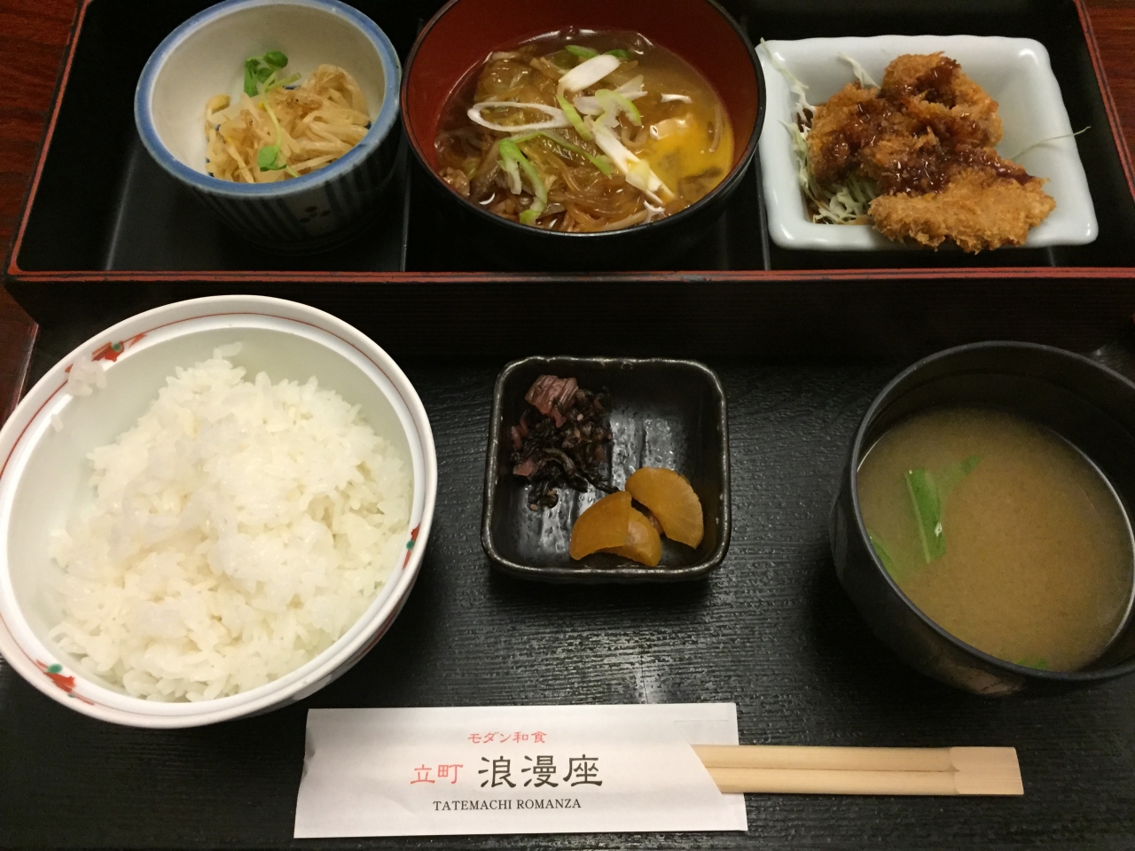 広電の立町駅から徒歩で約三分位の場所にあります。地下一階のお店で店頭入り口には当日の日替わり定食のメニュー等が掲示されています。