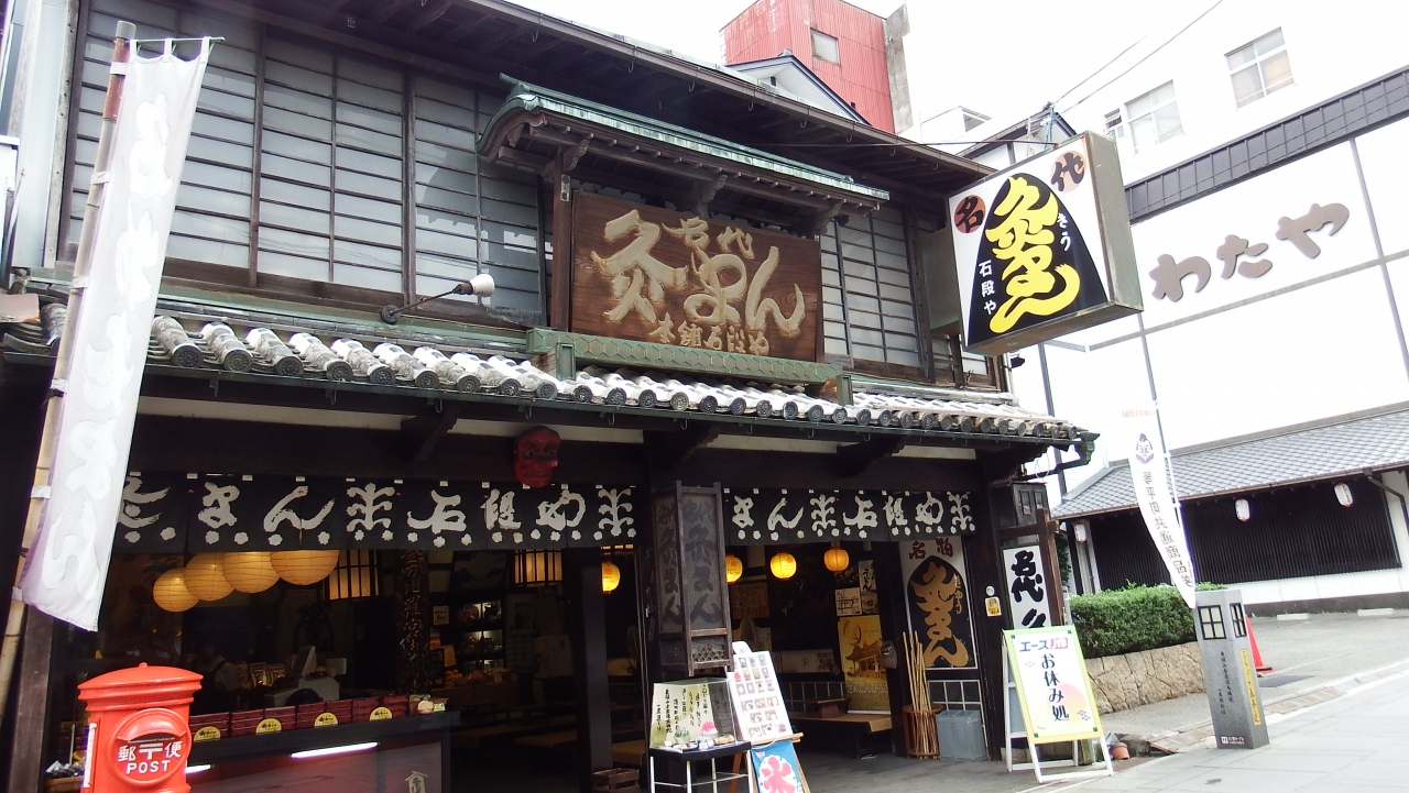 香川県に入るや、灸まんの看板だらけなので、よほど地元を代表する銘菓なのだろうと思い、金毘羅詣でのついでに入った。マンジュウは優しい味ですな。店内は金丸座と江戸時代の茶屋を足して割ったような雰囲気ね。うどんも売っているとは知らなかった。