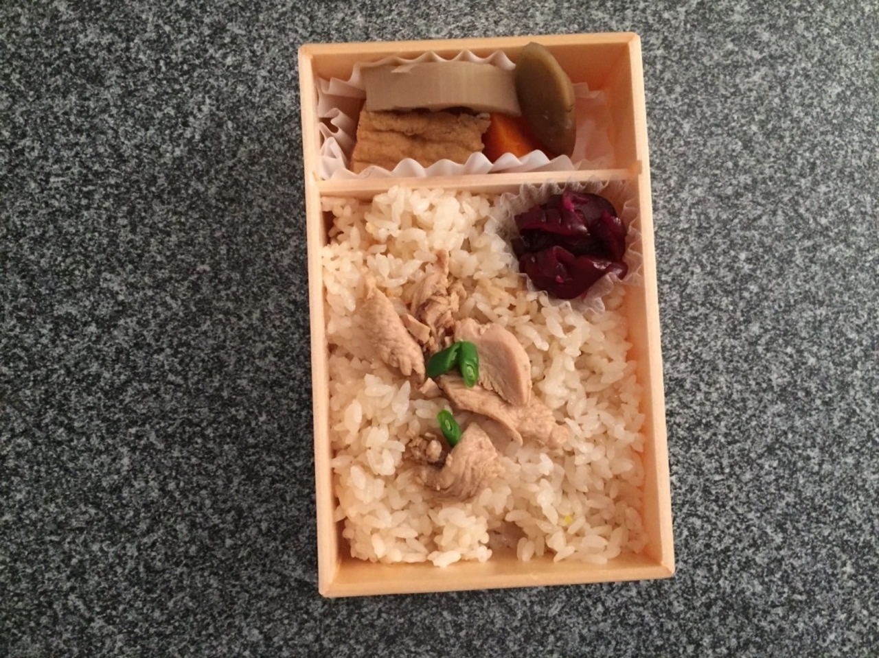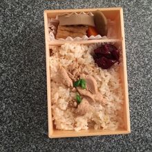 お届けランチです。開けたとたん、なんだか寂しい。予算ないのかな?食べてみると、おだしが効いた上品な味。美味しいのですが、これだけでは単調です。他のお料理を頂いてから、こちらのゴハンで締めるなら最高だと思いました。もっとお高いお弁当なら、きっと満足したはずです。