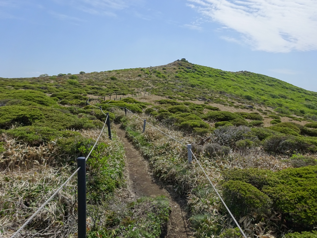 扇ヶ鼻分岐から登りをつめていくと扇ヶ鼻頂上です。西側からくじゅう連山が一望、また南には久住高原が広がります。天気もいいので、草の上でしばしまどろむのも一興。5月22日、ミヤマキリシマの群生はまだ咲いていませんでした。