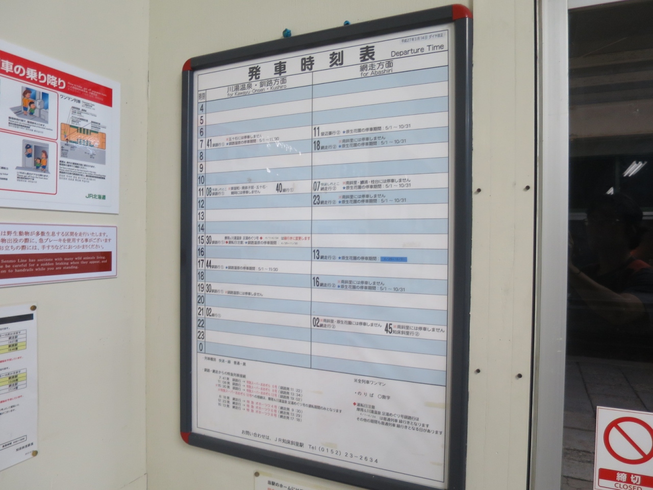 単線の釧網本線にあって、複線の駅で、緑・釧路方面ホーム側に駅舎があり、知床斜里・網走方面ホームへは跨線橋を越えていきますが、エレベーターなどはありません。