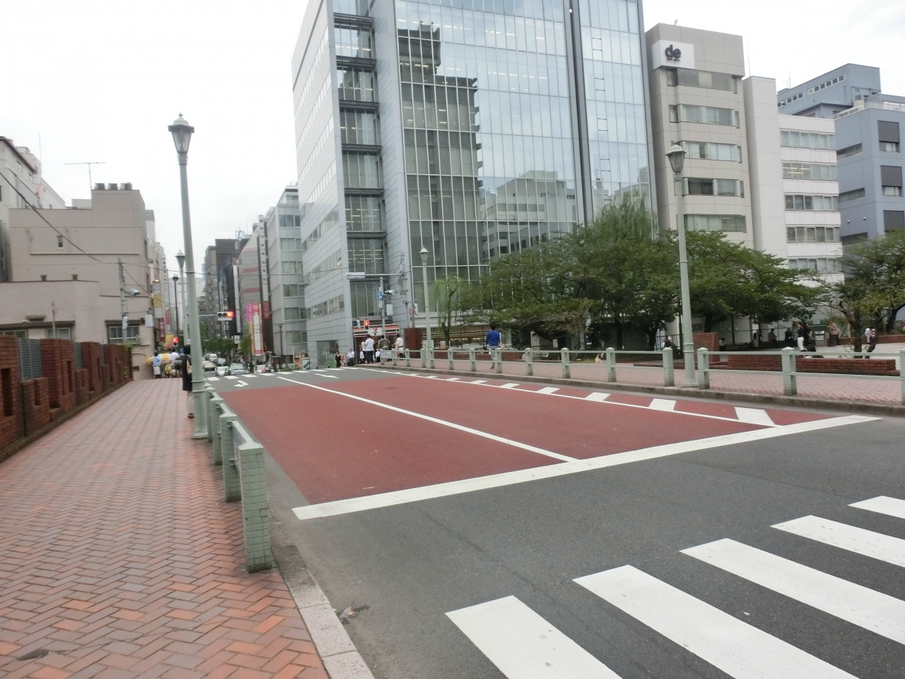 橋の名残を残す石柱が橋の両サイドに残っているが、現状は通行量の多い車道だ。