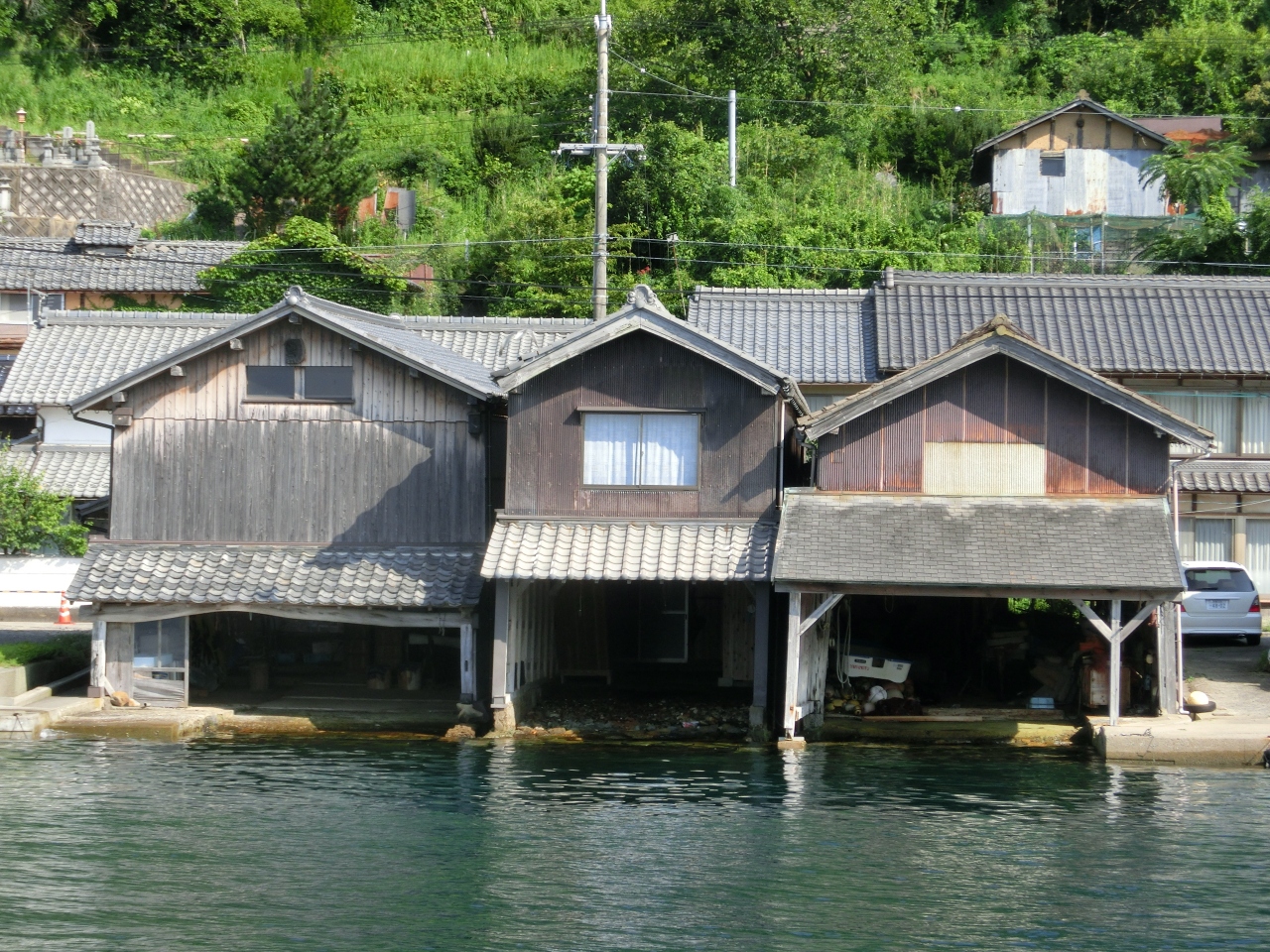 海に面して家が建っていて、と言うか、海の上に浮かんでいるようにすら見えます。だって1階部分が舟揚場になっていて、海に向かってポッカリ口を開けているのです。