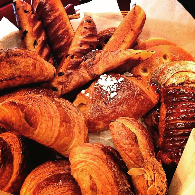 開店前でもすでに何人か待っていました。朝食は店員さんが持ってきてくれるかごの中からパンを2種類選択し、あとはシンプルなパンが付いてきます。ジャムは付け放題!サクサクのアプリコットデニッシュがとてもおいしかったです!