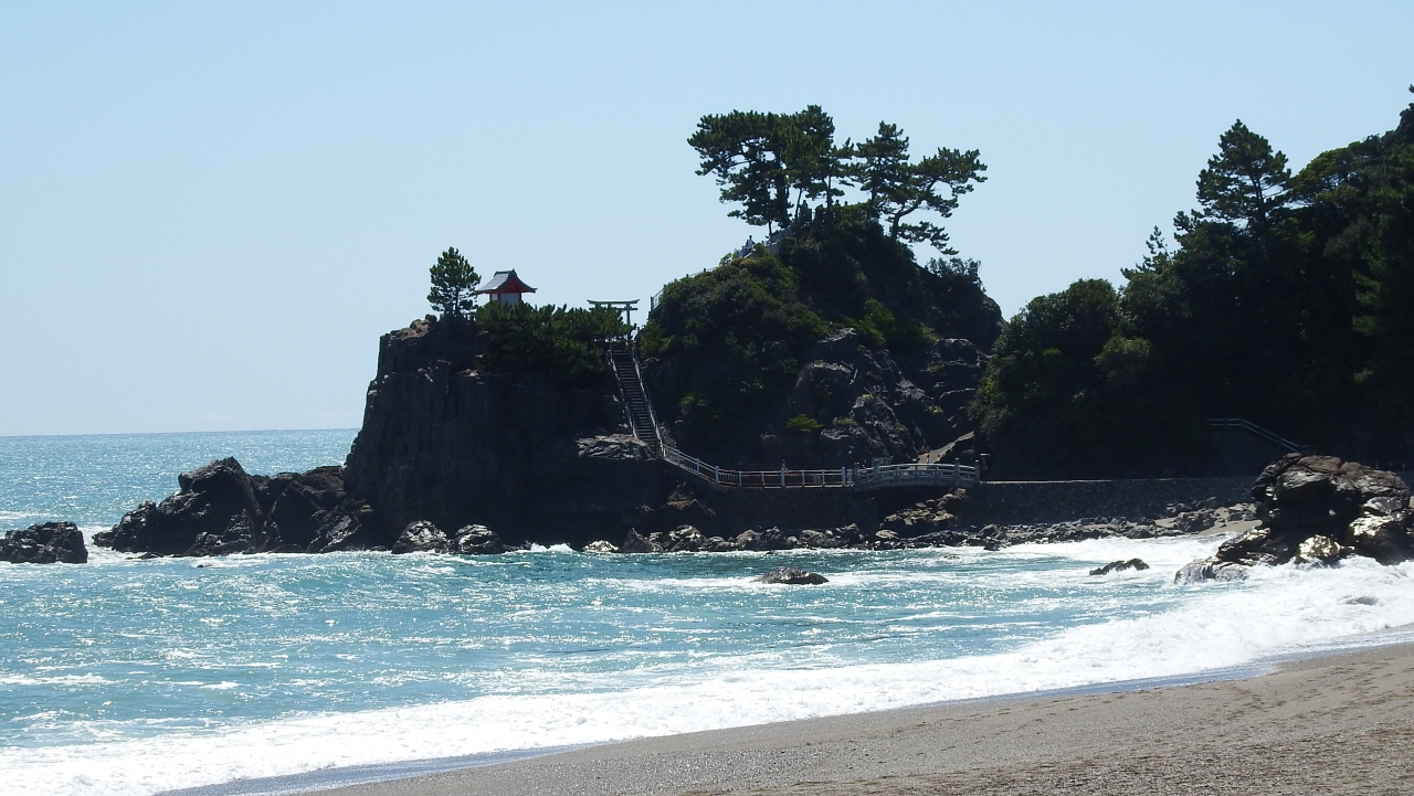 龍馬像の目線で海に向かい、右に視線を転ずると竜王岬が突き出ている。そこにあるのが竜王宮であり、正しくは海津見神社という。海神であるから、ギリシャ神話でいうならポセイドンである。神社と言っても祠程度のものだが、ここからの眺めは素晴らしい。