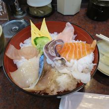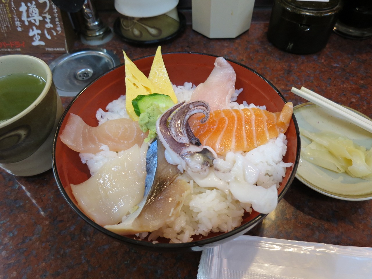 刺身6枚くらいと、卵焼きに茹でたゲソの、ご飯が丸見えの貧相な海鮮丼でした。
