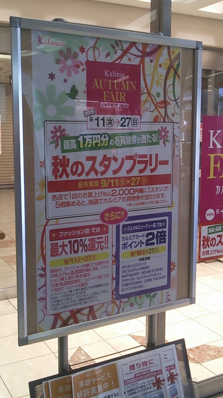 2015年9月20日現在、「カルミアオータムフェア」なる企画が実施中で、?1店舗につき2000円以上の買い物をすると貰えるスタンプを5つ集めると抽選で10000円の商品券が貰える企画?ファッションの取扱店では1店舗2000円ごとに最大10%分の購入割引券が貰える企画等が開催されています。