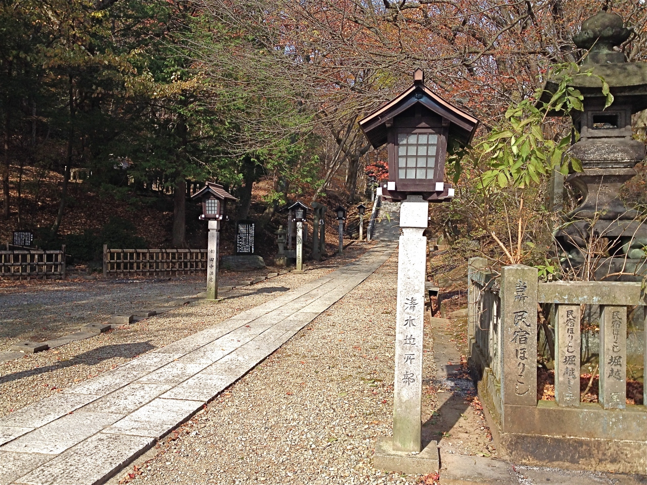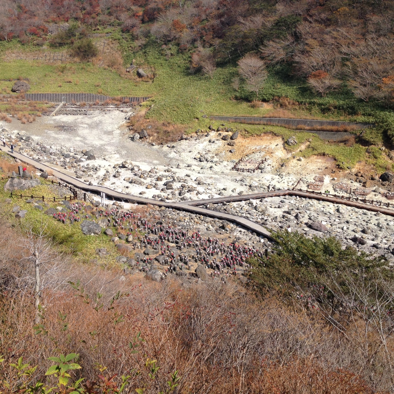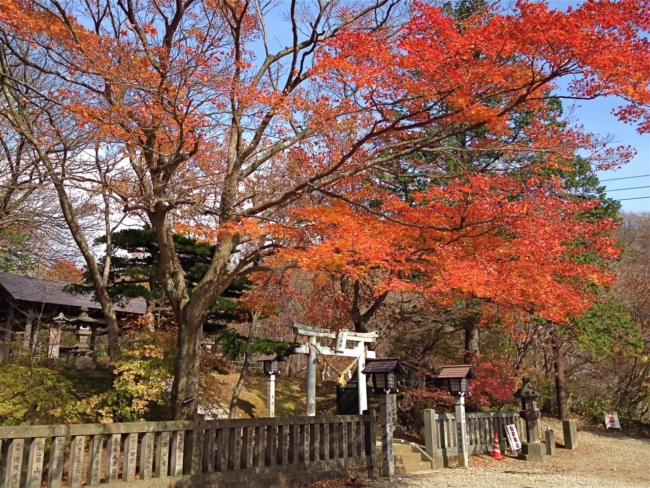 殺生石のすぐ上にある神社で殺生石のある河原を一望することができます。高低差はありますがこの神社と殺生石は遊歩道で繋がっているのでぐるっと一周してみるのも良いですよ。写真は10月末の様子です。紅葉のピークは過ぎていますがまだ赤が奇麗な場所もありました。