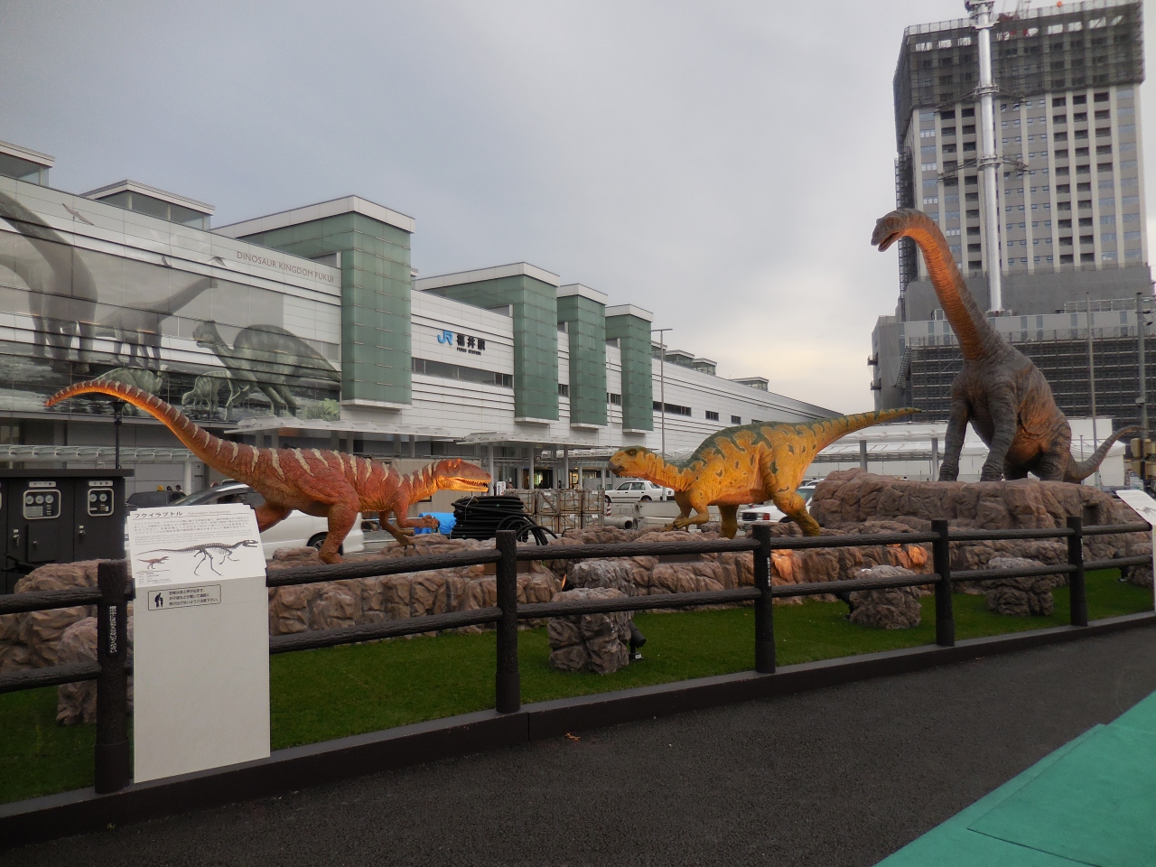 福井駅の西口の前には勝山市で発掘されたフクイラプトル、フクイサウルス、フクイティタンを表した3体の巨大な恐竜のモニュメントがあり、動きながら鳴き声をあげていました。恐竜が鳴くと子供達が喜んで近寄って来てみていました。モニュメントは今年12月まで置かれ、来年3月の西口広場の整備完了に合わせて、駅周辺に再配置されるそうです。