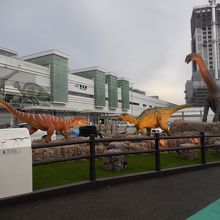 動きながら鳴き声をあげる3体の巨大な恐竜のモニュメントがあります