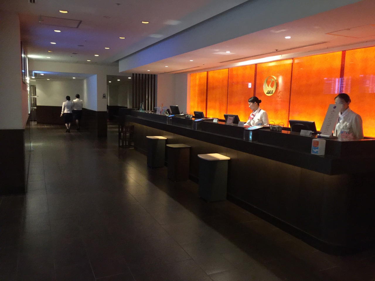 中に入ると長いエスカレーターがあり、その上には豪華なカウンターで女性が笑顔で迎えてくれる。サクララウンジ利用者は右に進むように案内される。