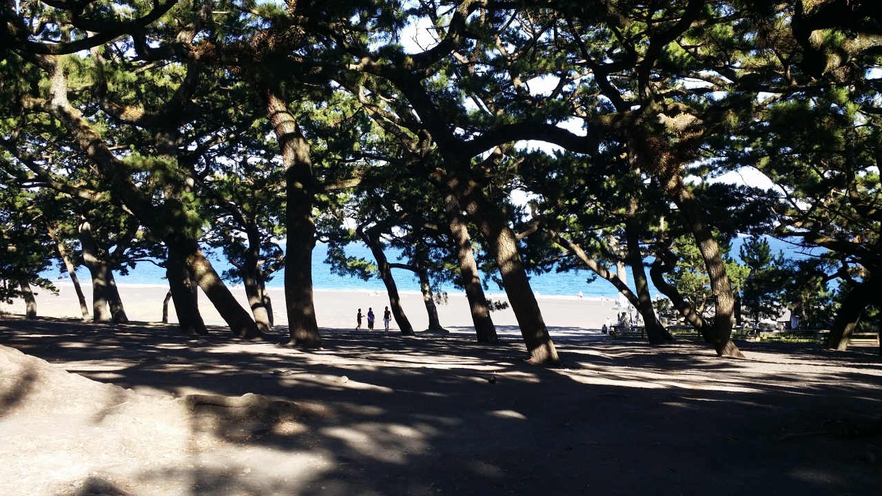 砂浜の白と松の緑と海の青のコントラストがまぶしいこと。