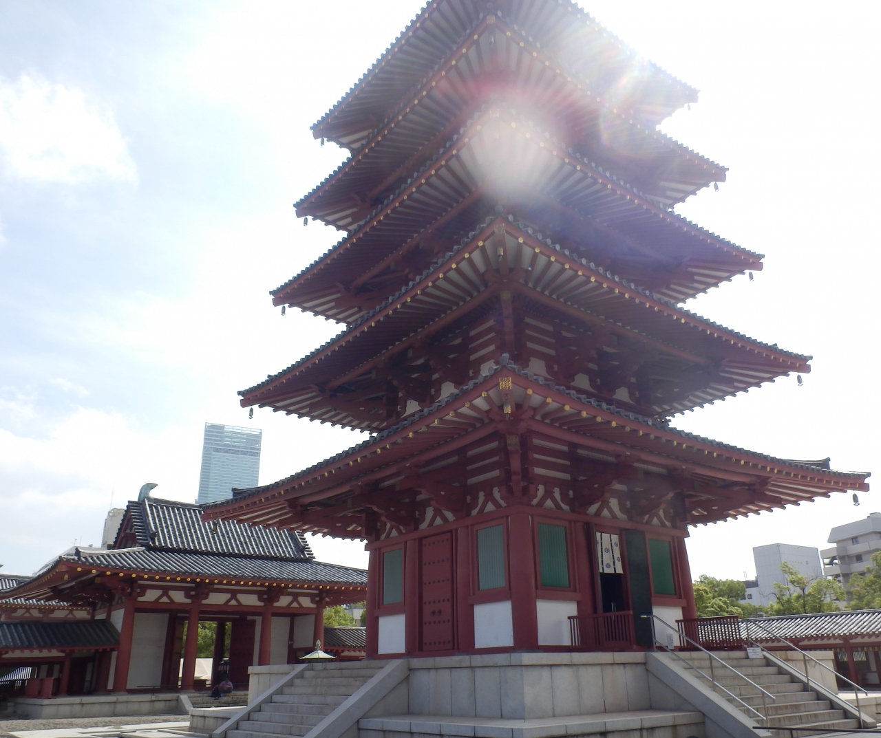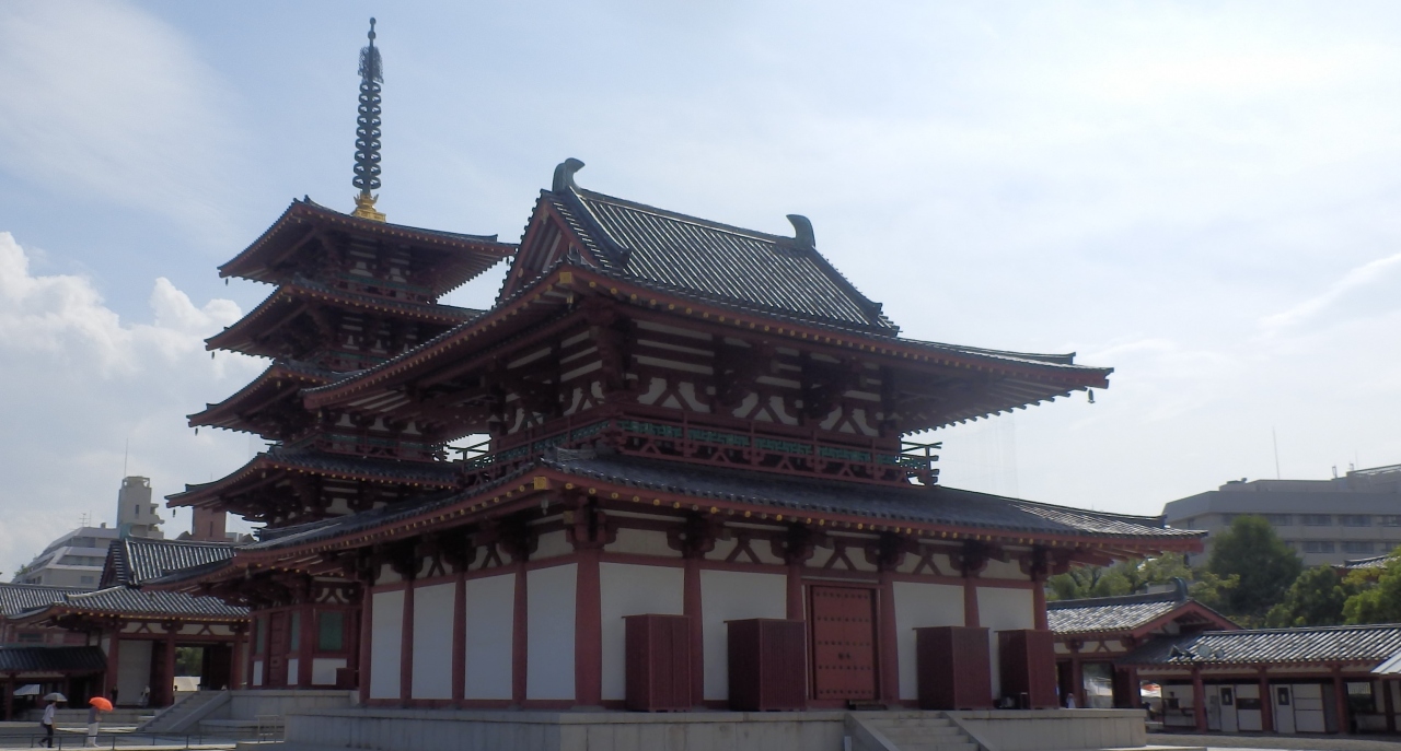 四天王寺は聖徳太子が建立された七大寺の一つ、伽藍配置は主要な塔堂が南北に一直線で南から北に向かって,中門、五重塔,金堂、講堂と並んでいる、五重塔と同様に戦後に建てられたものである、古いお寺では金堂と呼んでいるが本堂のこと、本尊は救世観音像で周りを四天王像が取り囲んだ配置になってる、