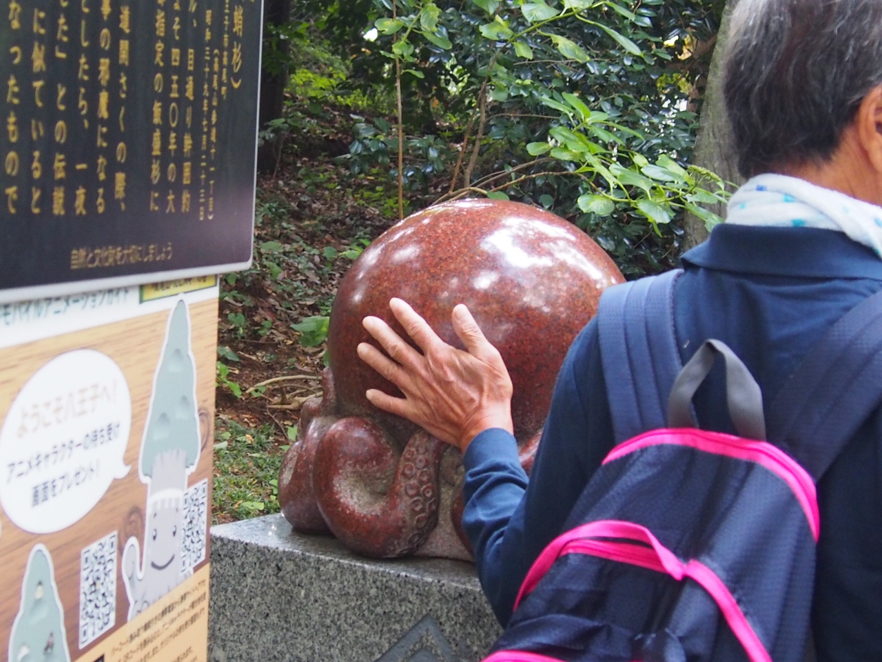 すぐ隣にはたこスギがあります。たこスギには多くの人の手からその根を守るためにいつの日か柵が造られました。そしてまたその横に出現したこのひっぱり蛸。たこスギを守るために設置されたのならばその作戦は成功したようです。多くの人はこちらを撫でています。