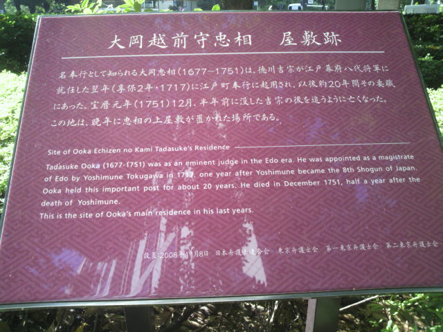 弁護士会館の前に、大岡越前忠相屋敷跡があります。