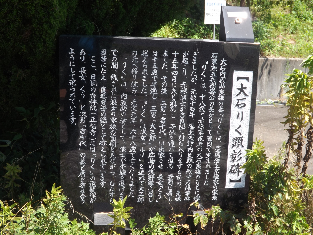 見性寺(けんしょうじ)見学のあと車で大石りくの遺髪塚へ移動。ここは、初めてだったので少し期待して来ました。大石りくでは、知らない人が多いと思うのですが、忠臣蔵で有名な大石内蔵助の妻だと言えばわかると思います。豊岡藩筆頭家老石束源五兵衛の娘で、大石内蔵助に嫁いだそうです。しかし、最近の小中学生は、ほとんど大石内蔵助を知らないようです。テレビでやらなくなると日本人の記憶から消えていく感じです。