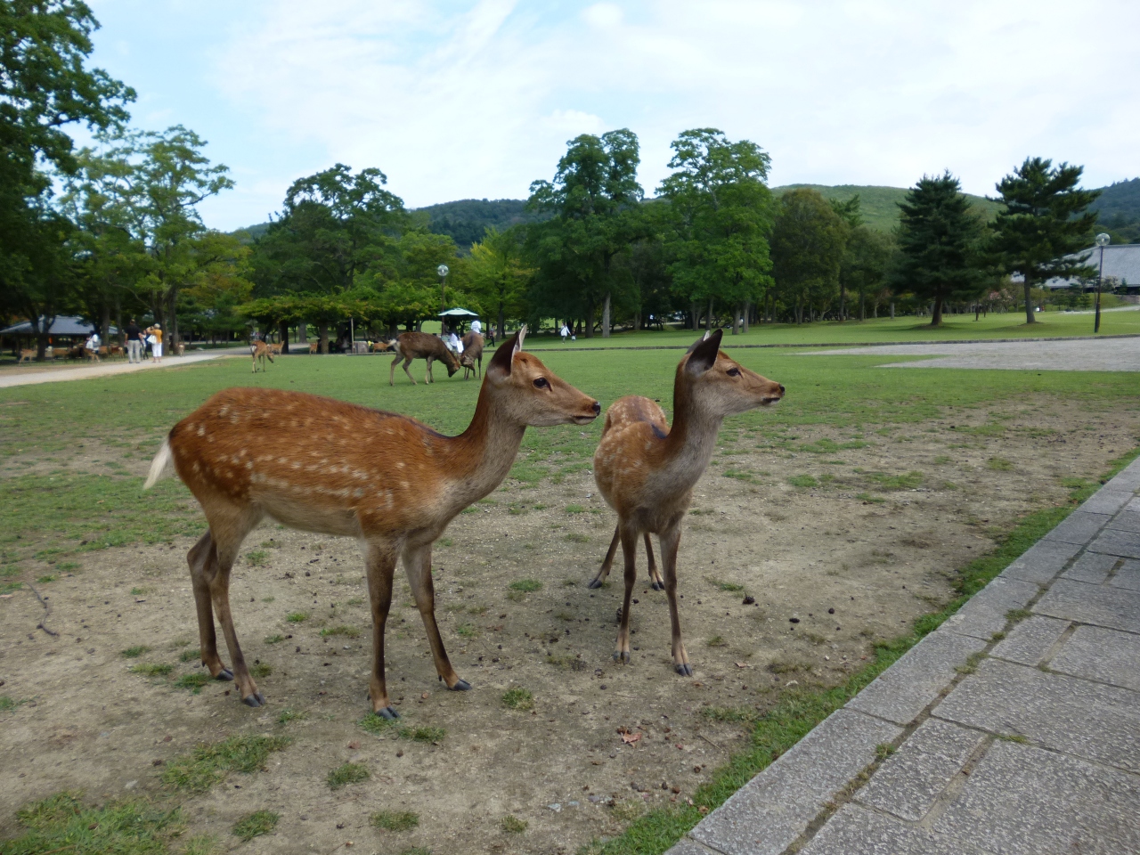 奈良公園を歩いていると数多くの鹿と出会います。9月でしたが、中には小鹿の姿も見られました。鹿せんべいを購入すると、取り囲まれ口でつつかれるので、小さなお子さんはびっくりするかもしれません。普段はおとなしく、頭をなでてやることも出来ます。