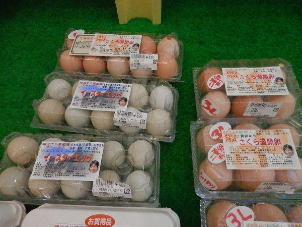 閉店まぎわに立ち寄りましたが、小松菜・ほうれん草・長ネギなど、普段買い物をするスーパーより半額以下の値段で売っていたので、まとめ買いしました。イースターエッグ・さくらたまごなど初耳の卵が売っていて、他にも聞いた事のない卵がずらり並んでいます。そう言えばすれ違ったご婦人方も沢山の卵を買っていました。千葉県は卵が物産品なんですね。