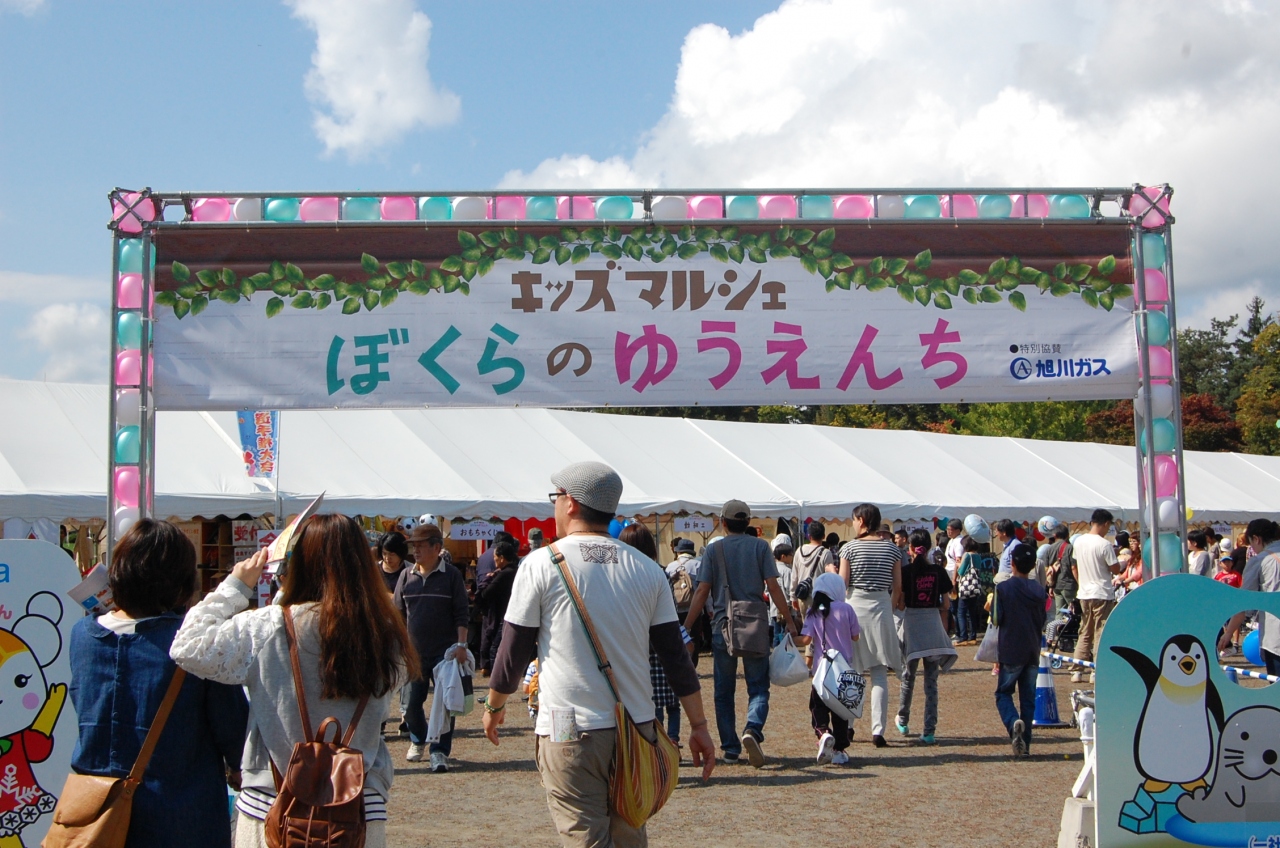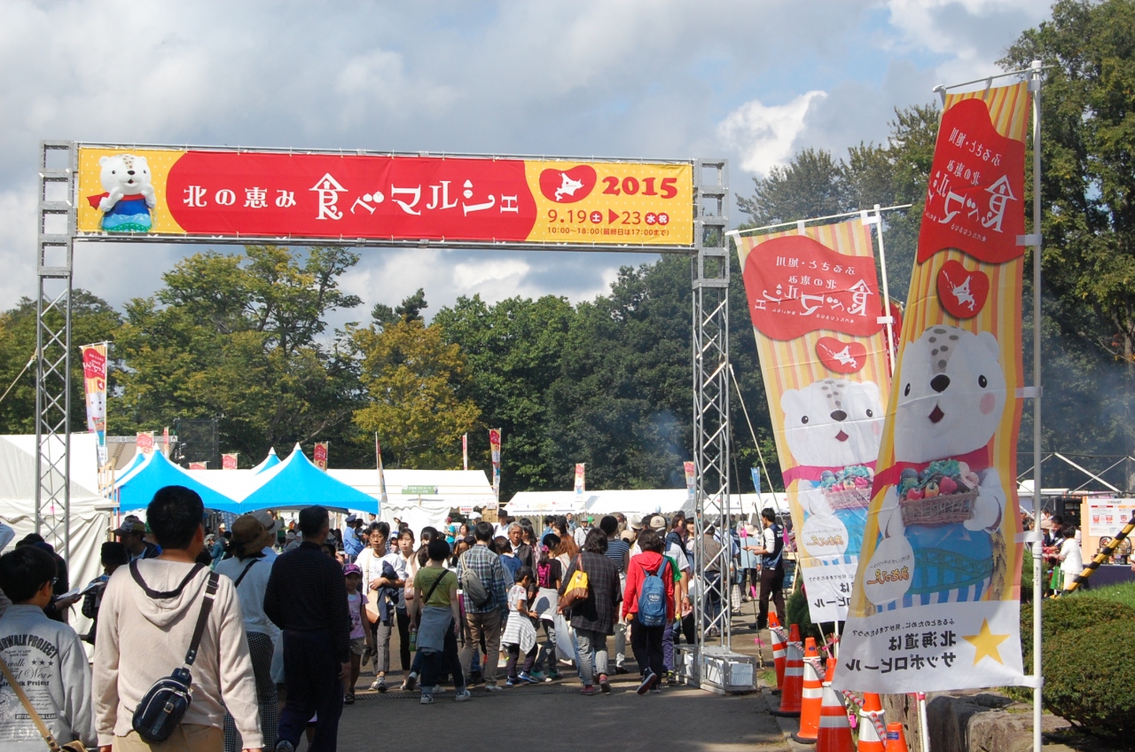 この時期に、旭川で食べマルシェが行われていることは、以前から知っていたが今まで行く機会がなかった。今回、孫達が遊びに来ていたので、娘ファミリーと共に行くことになった。食べマルシェ周辺は旭川の中心街で、無料駐車場はもちろんないので、大雪アリーナ奥が臨時駐車場となって会場までシャトルバスが出ている。駐車場に入るときバス停にはとても長い行列ができていたが、車を置いて大雪アリーナ前のバス停に行くと、それほど並んでおらず程なくシャトルバスが到着して乗り込んだ。常磐公園会場には子どもが遊べるところもあるということなので、常磐公園会場前で降りて食べマルシェに初挑戦した。