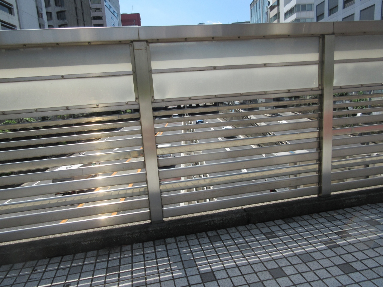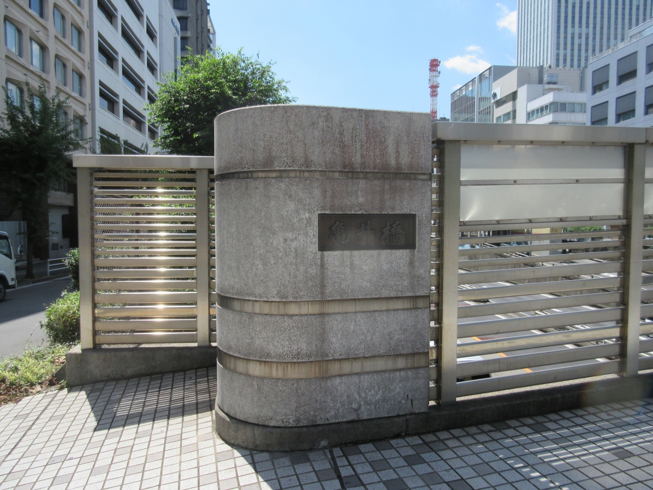 東京メトロ・新富町駅から徒歩5分、中央区役所を左折すると、築地警察署前に銀色欄干の亀井橋があります。亀井橋沿いに築地川亀井橋公園があり、歩道はカラータイル敷きです。銀色欄干のすき間から首都高を走る自動車が、やっと覗けます昔の築地川の景色はではないのです。
