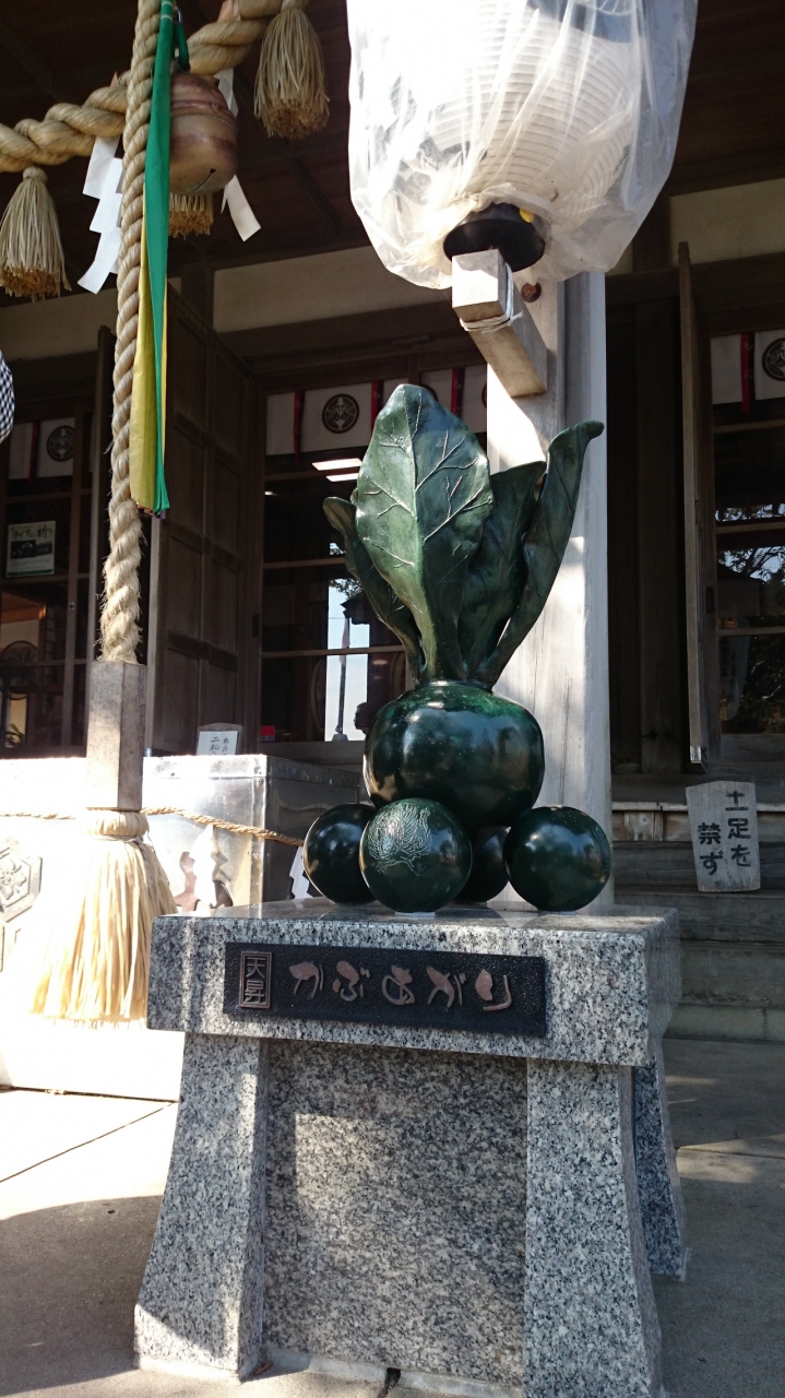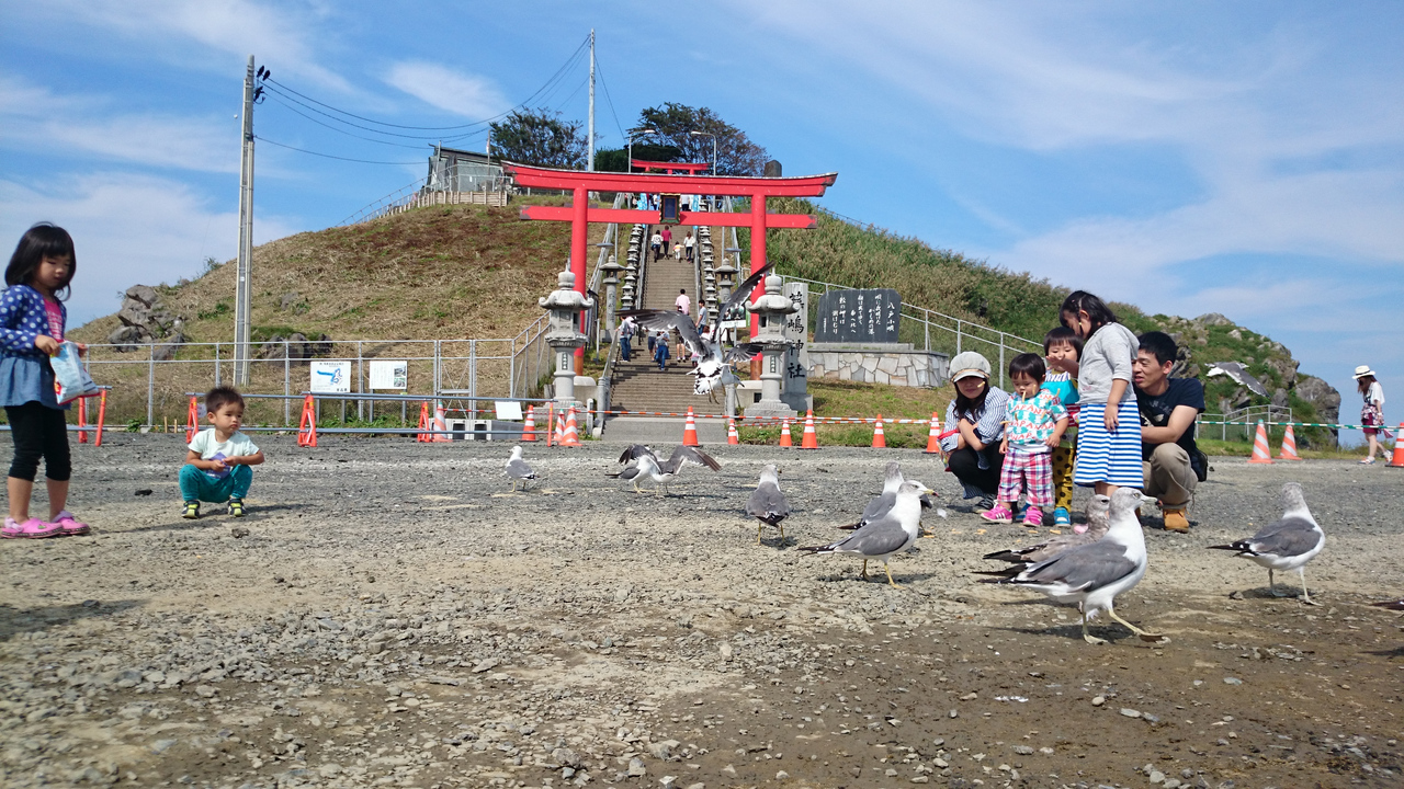 ウミネコに囲まれて階段をのぼると見晴らしのよい場所に出ました。神社の周りを三回まわっておまいりし、右側にあるかぶを三回なでるといいそうです。ちなみに左側にはひょうたんがあります。