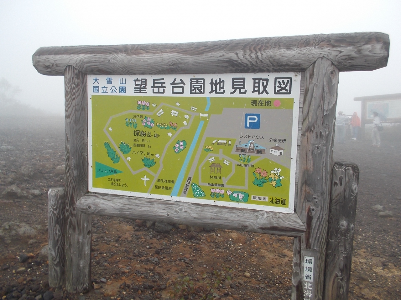 本来ならば、ここから美しい十勝岳の風景が見えるはずなのですが、私が行った時には濃霧の為に何も見えませんでした。 駐車場には、ただトイレがあるだけで、左側の山側からはトレッキングが出来るはずなのですが、どこが道なのかも分かりませんでした。 自然だけは人間の力ではコントロールできないので、あきらめるしかありませんでした。