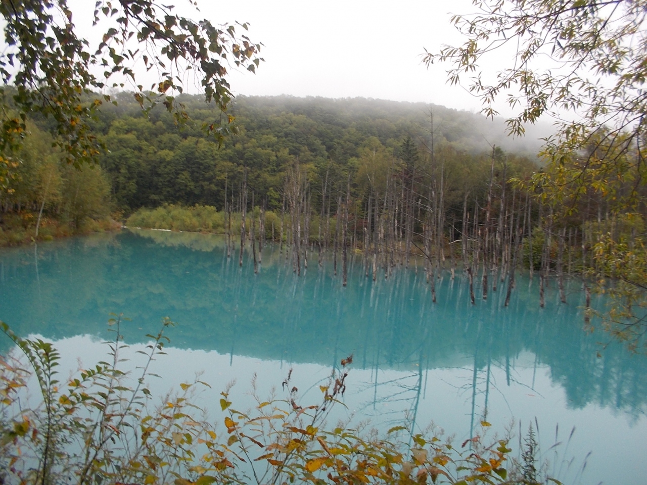 駐車場に車を止めて5分位、舗装されていない道を歩くと、急に「青い池」が見えます。 白神山地の「青池」に似ていますが、こちらの方が「薄い青色」をしています。 雨量によっても青の濃さがちがうようですが、神秘的な青色でした。 十勝川につながっているようです。