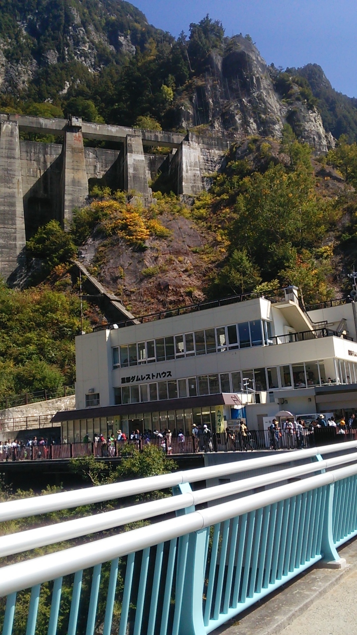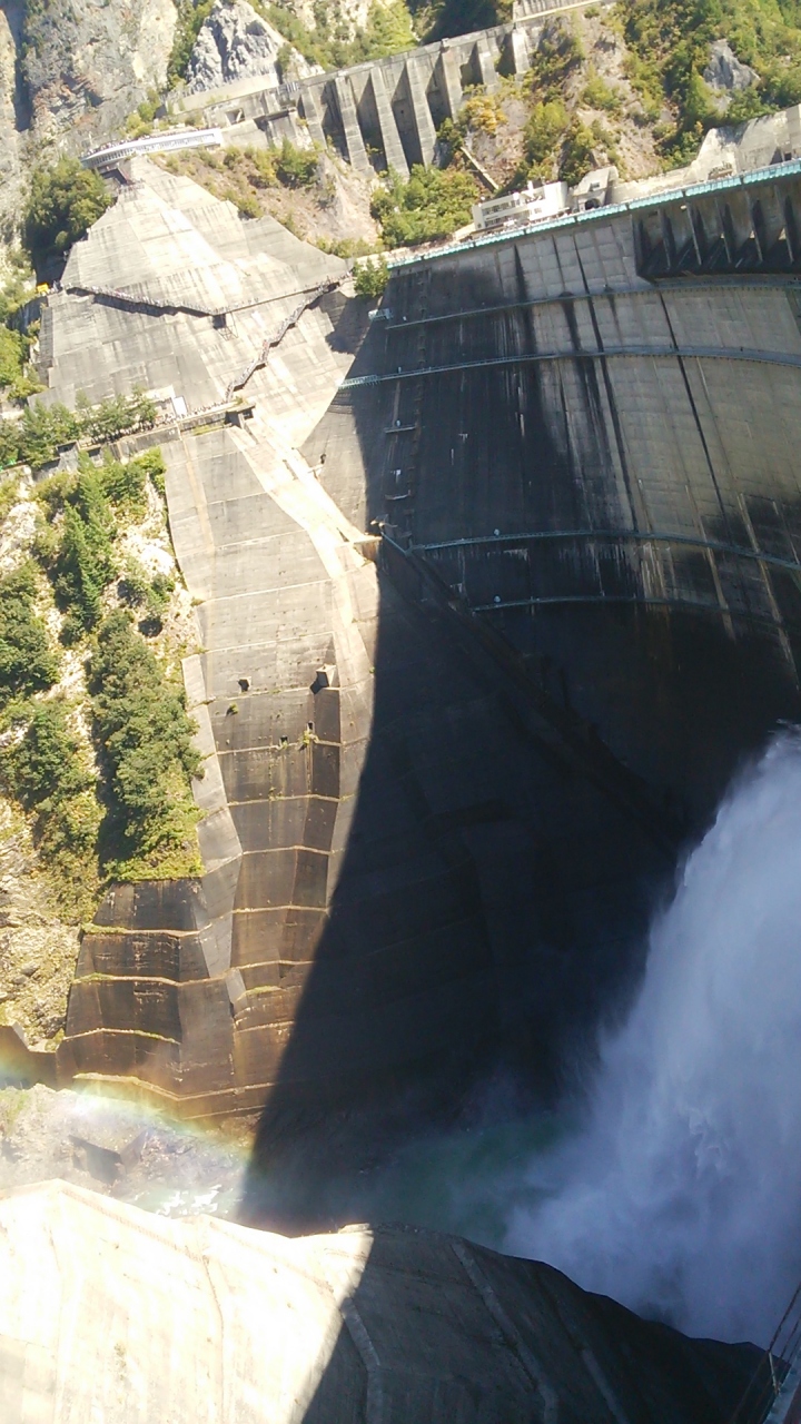 富山側からケーブルカーを乗り継ぎ、黒部湖駅に降りたつと地下道が続きます。地下道を抜けるとダムの堰堤が現れます。右側が黒部湖,左側が堰堤から放水された水が黒部川となって顆粒に流れていきます。ダムからの放水は堰堤の中心部から覗き込むと恐怖さえ覚える大迫力です。立山黒部アルペンルートの観光地として、有名な黒部ダムも昭和の大事業として多くの人たちに支えられて完成したと思うとその雄大さと人々の偉大さに感服させられますね。