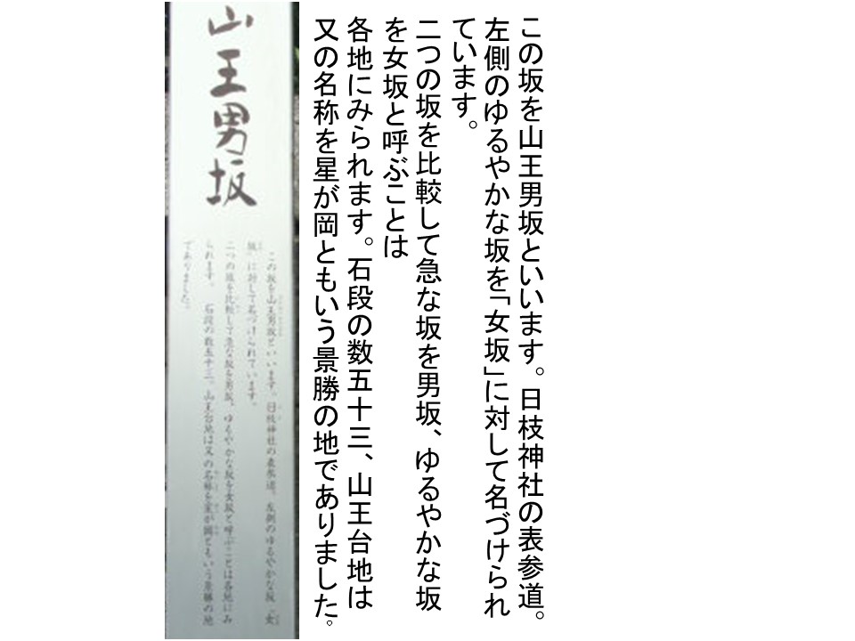山王男坂の勾配が急となっている関係上、女性等が昇るための勾配が緩やかな山王女坂が、北側に、別に設けられています。