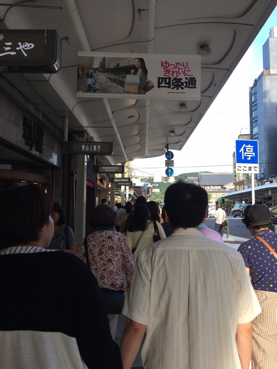 最近、歩道が広がった四条通。京都観光の華といえる街だけあって、道が広がってもいつでも人で賑わっています。ほとんどがアーケードになっているので、覆いがついているので日除けにも雨除けにもなって歩きやすいです。
