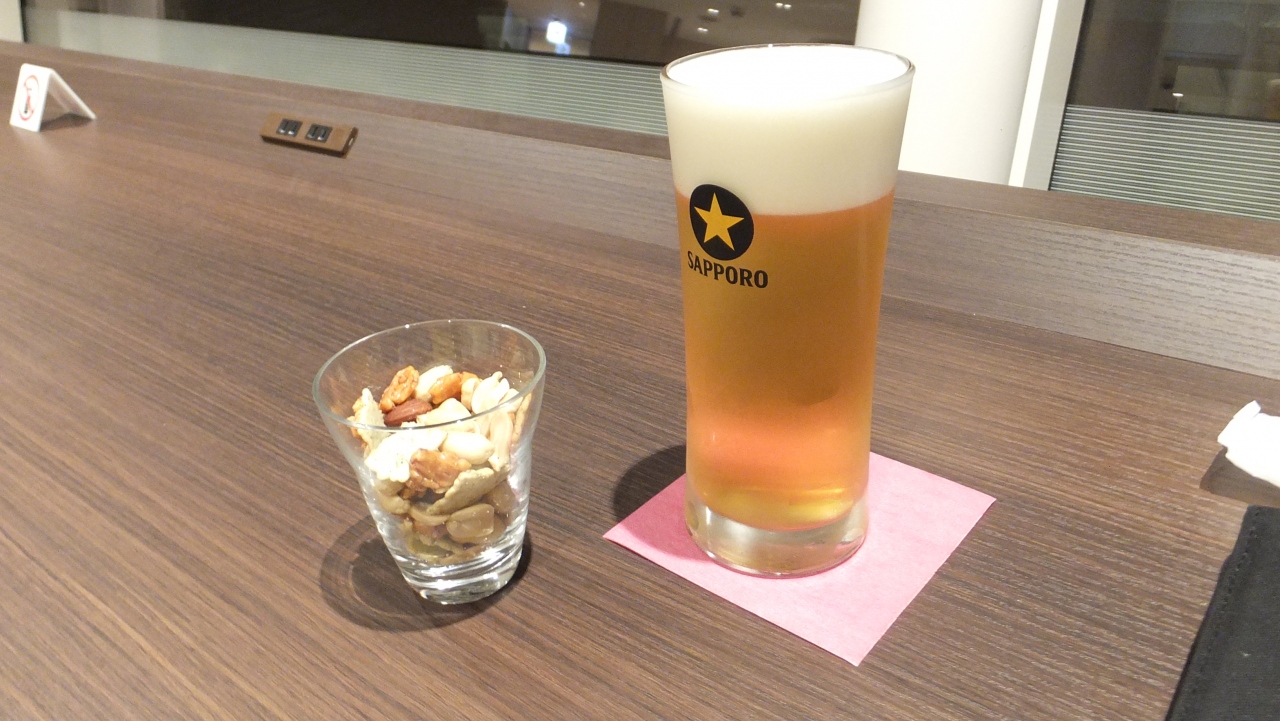 羽田はアルコール類は有料(生ビールとおつまみで690円)です。成田は一杯だけはアルコール類も無料なんですがね・・・。