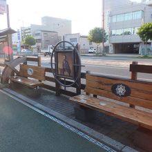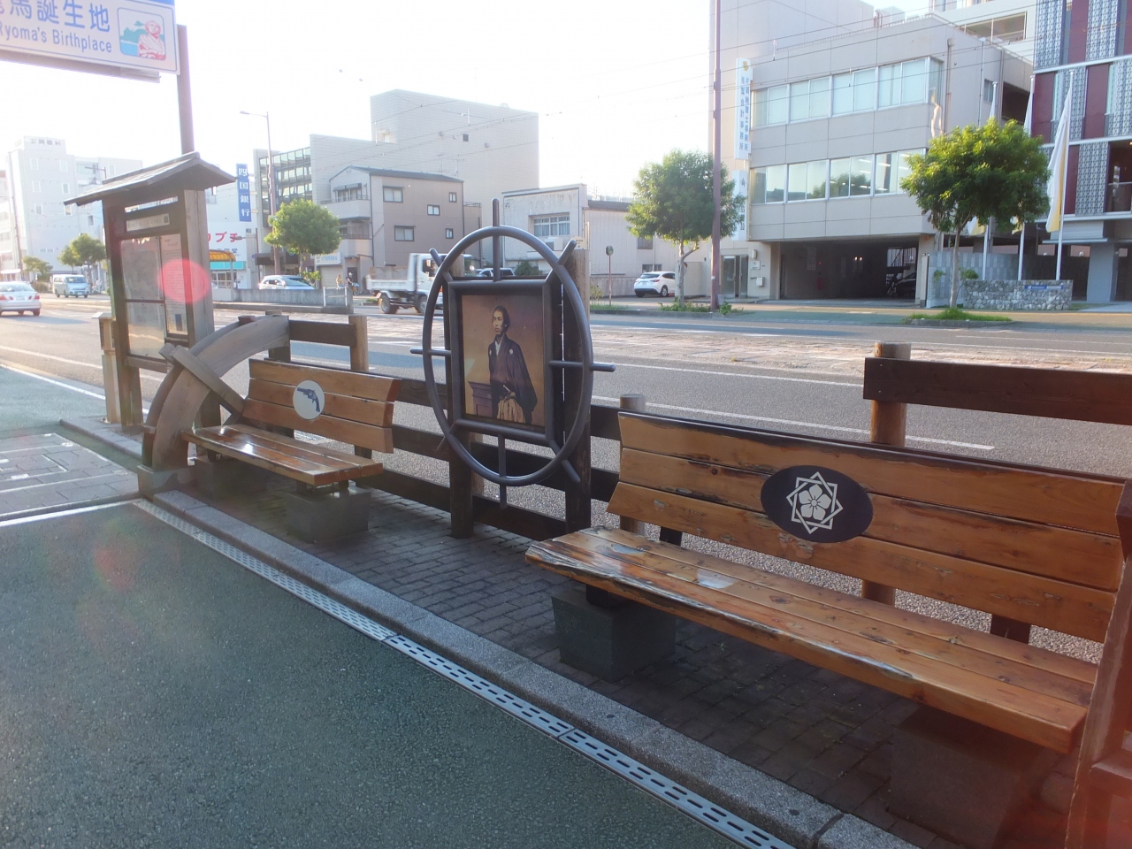 路面電車を「枡形」ないしは「上町一丁目」で降り、通りの南側の上町病院を見つければ、その目の前にプレートやベンチなどがある。ベンチの背もたれには坂本家の家紋があしらわれている。裏手にはホテル南水があり、龍馬絡みの展示などで有名である。