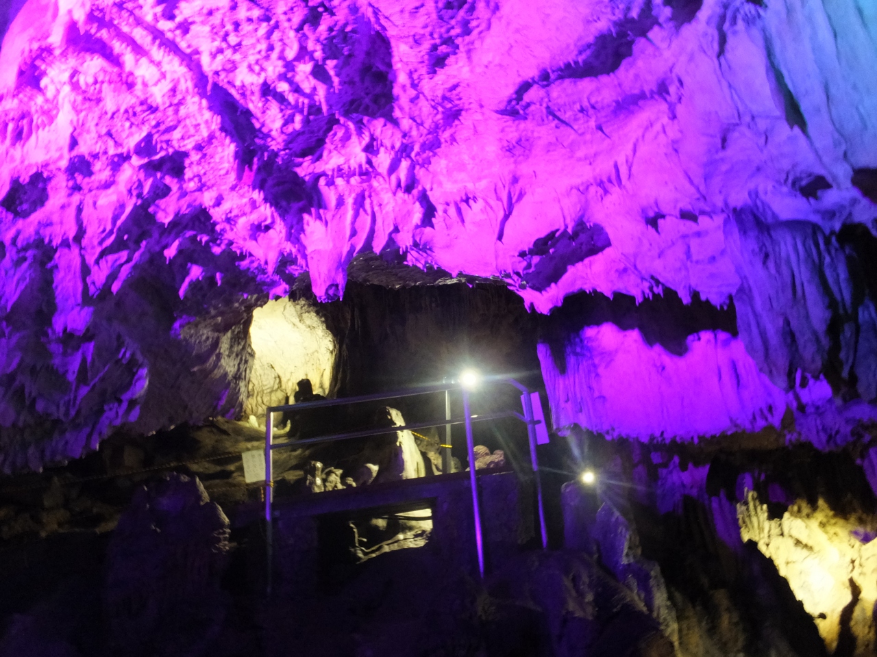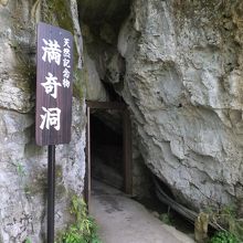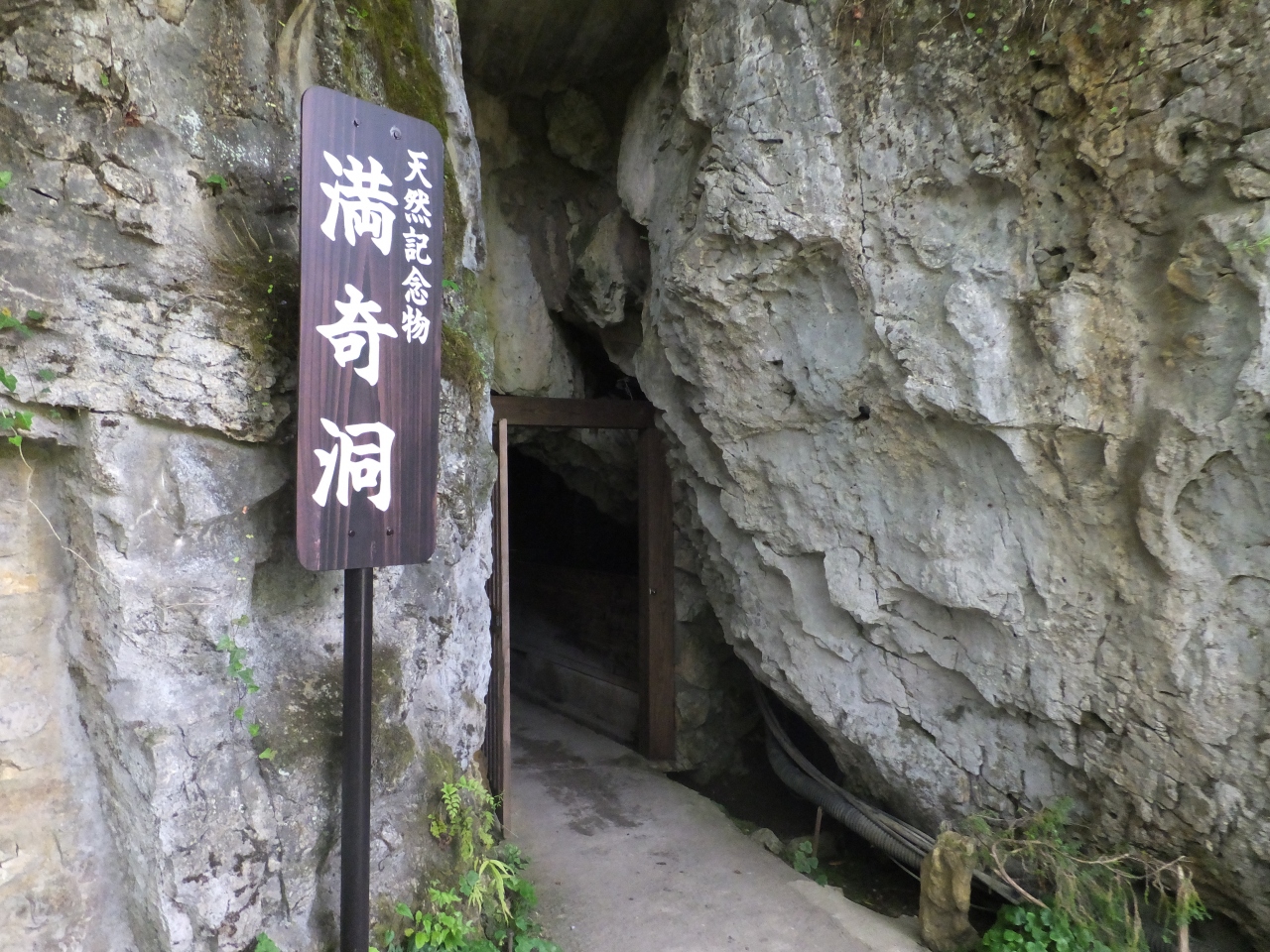 井倉洞へ行く前に寄りました。満奇洞への直前は車の対向が困難な細い区間ですが,ゴールデンウィークということもあって警備員の方が立っていて,区間に一方向ずつ車をいれていました。駐車場降りたあと,洞窟入口までは急な坂になっています。洞窟の中はきれいにライトアップされています。途中洞窟の高さが低くなっているところもあり腰をかがめて進むようになります。