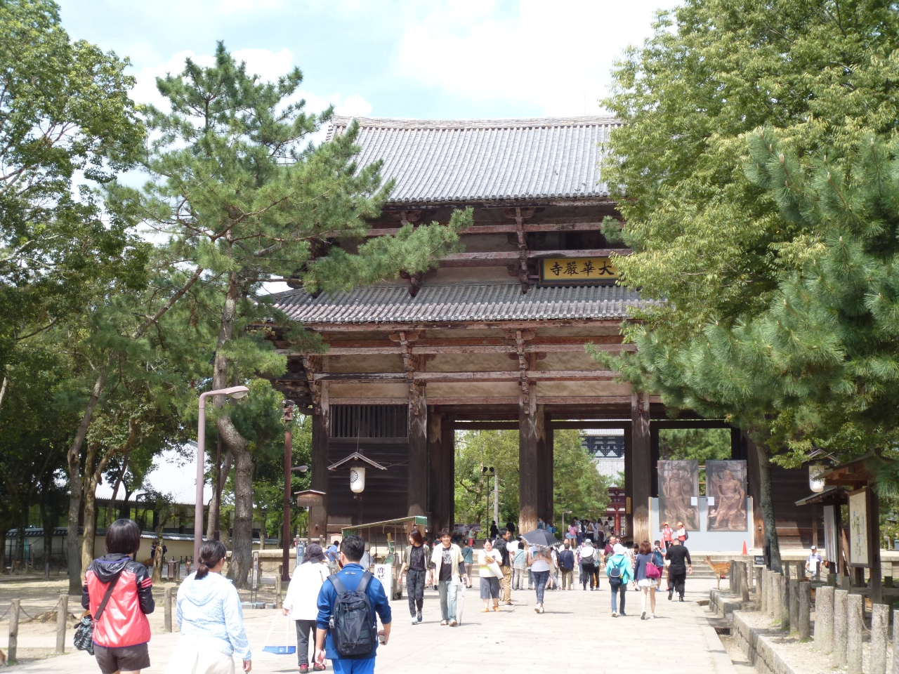 沢山の鹿に目をやりながら、東大寺の参道を歩いていくと、南大門が見えてきました。近づくにつれ、その大きさに驚かされます。まさに、青空にそびえ立っているという感じで、門から威厳を感じます。門の間から大仏殿の屋根が見えます。
