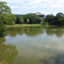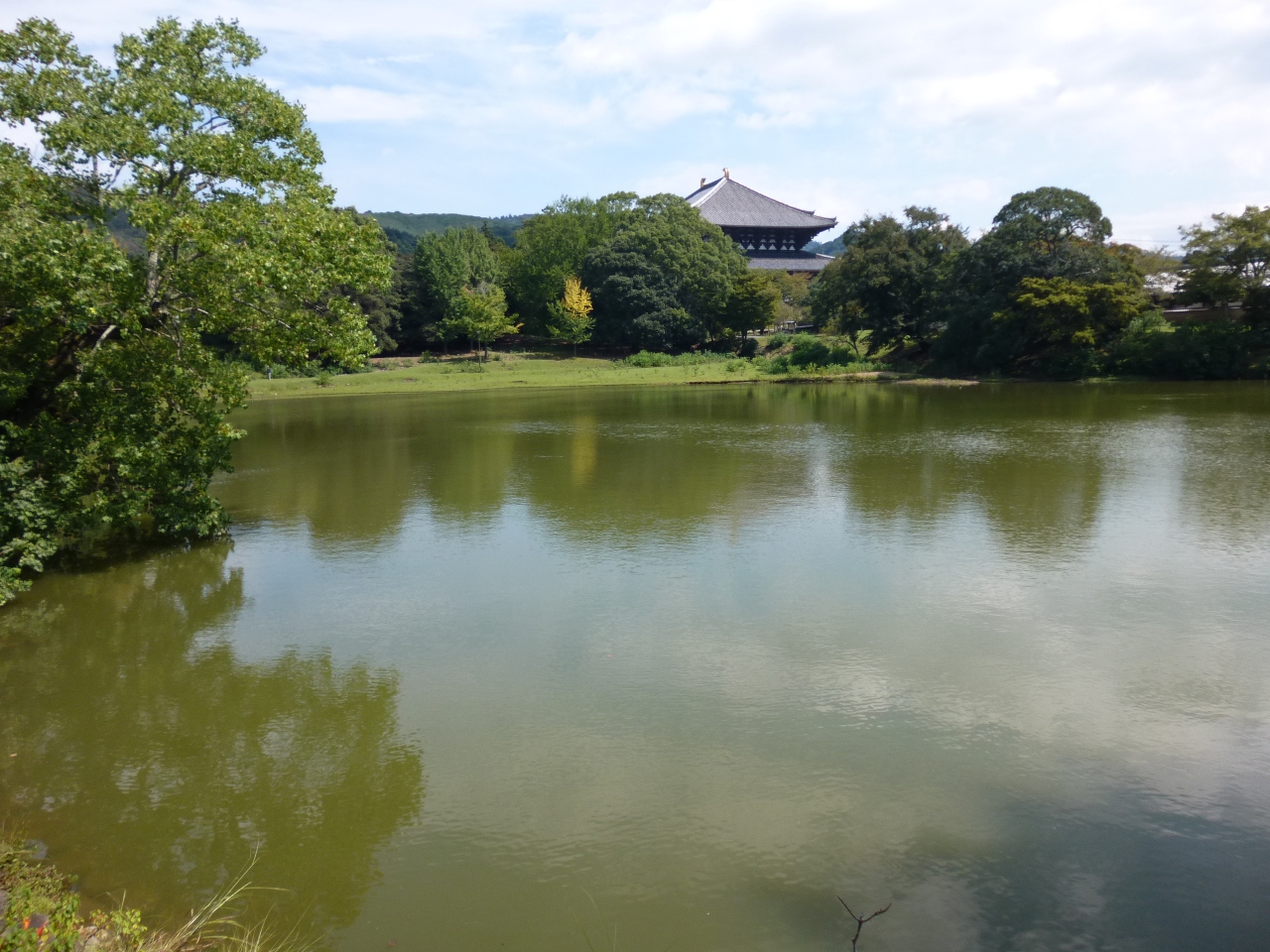 東大寺の西側に大仏池があります。この辺りまで来ると、観光客も少なくなります。持池の周りは、多くの木々に囲まれ、池に緑が映りこんでいます。その木々の向うに、東大寺の大仏殿の屋根が見えます。ライトアップされる時期もあるようです。