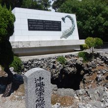【要注意】2015年9月。大きく口をあけている第三外科壕の後ろにある白い巨大な石碑は、本来のひめゆりの塔ではなく、慰霊碑です。ひめゆりの塔は、右手にある小さな石碑です。