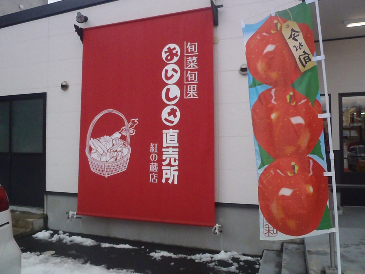 JR山形駅東口から真っ直ぐ東へ県道16号線を徒歩約10分、奥州街道国道112号線沿いにある紅花商人長谷川家の蔵屋敷山形まるごと館紅の蔵の裏側の駐車場スペース内に建つ産直品直売施設です。