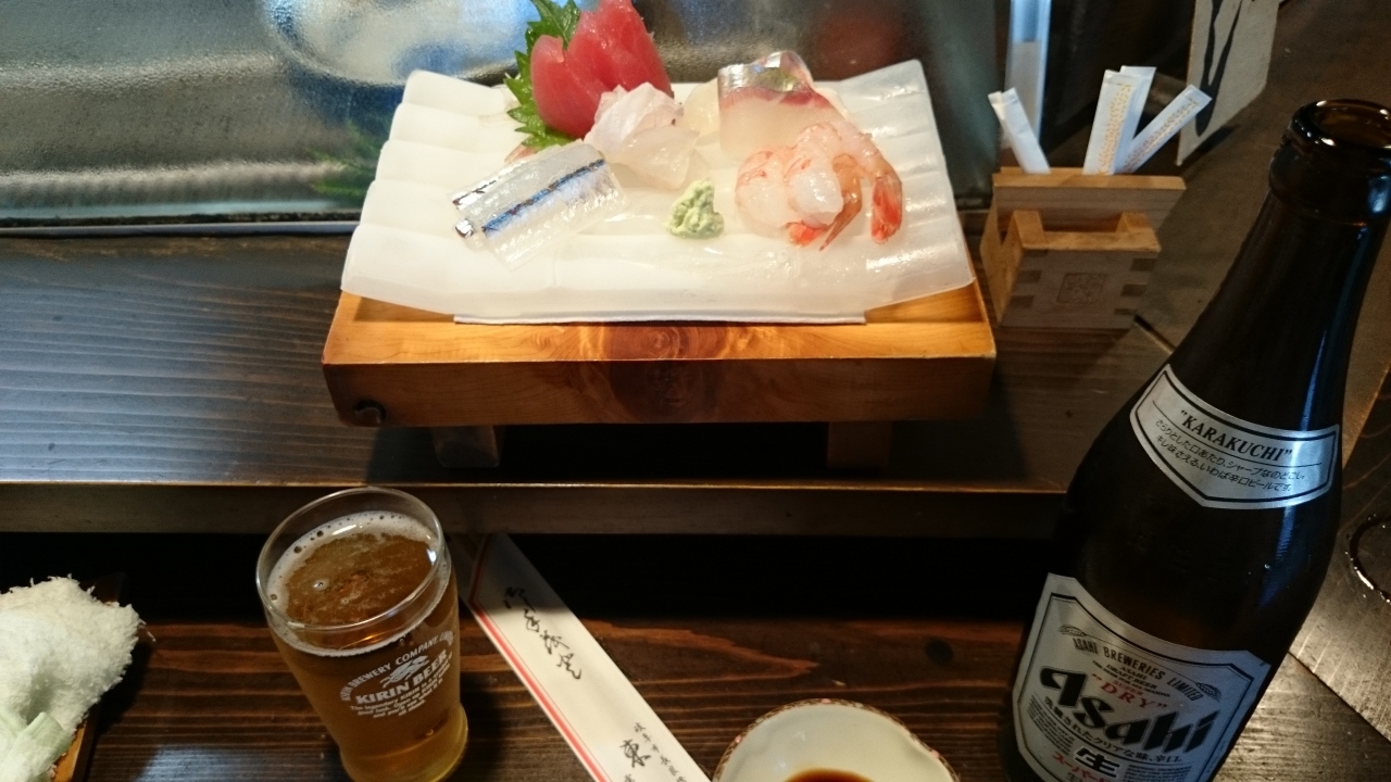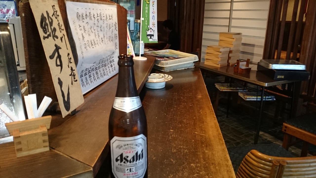 刺身のおつまみ、名物鮎寿司、こはだの握りと瓶ビール3本で5千円でやっていただきました。