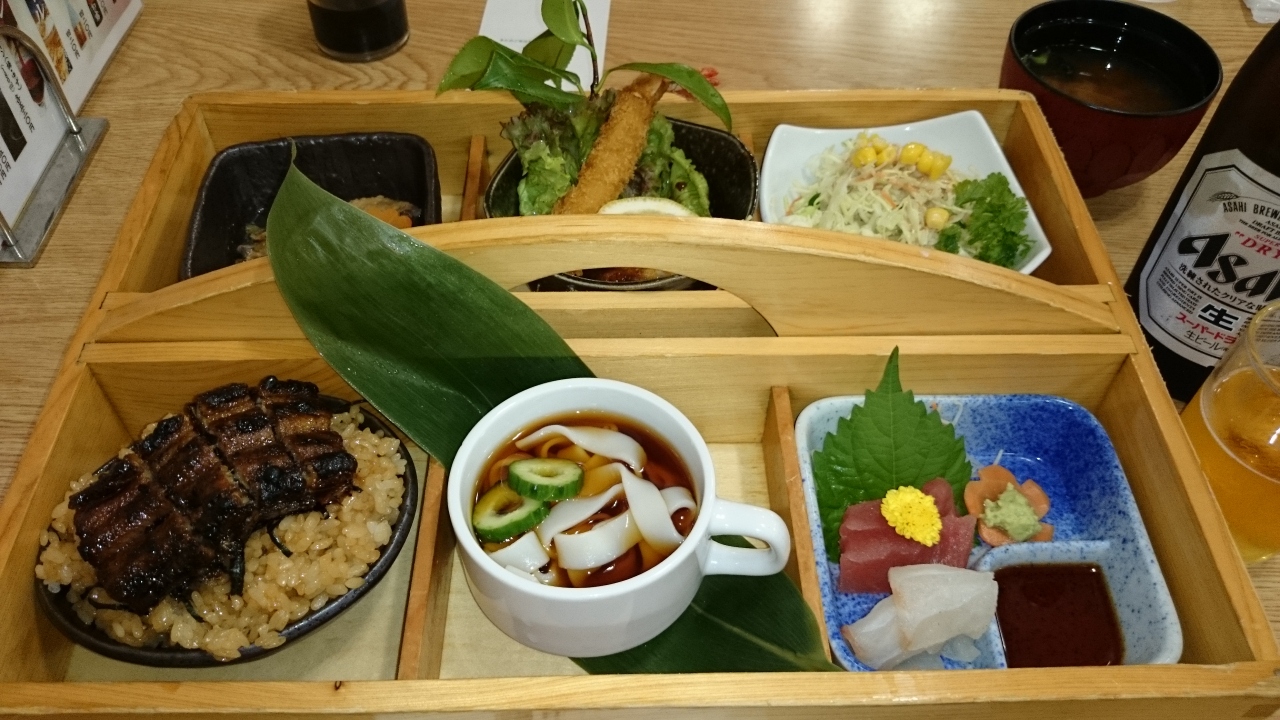 ひつまぶし、手羽先、海老フライ、お刺身、サラダ、きしめんと名古屋飯が満喫出来ます。お味噌汁付きで確か2100円だったかと。。