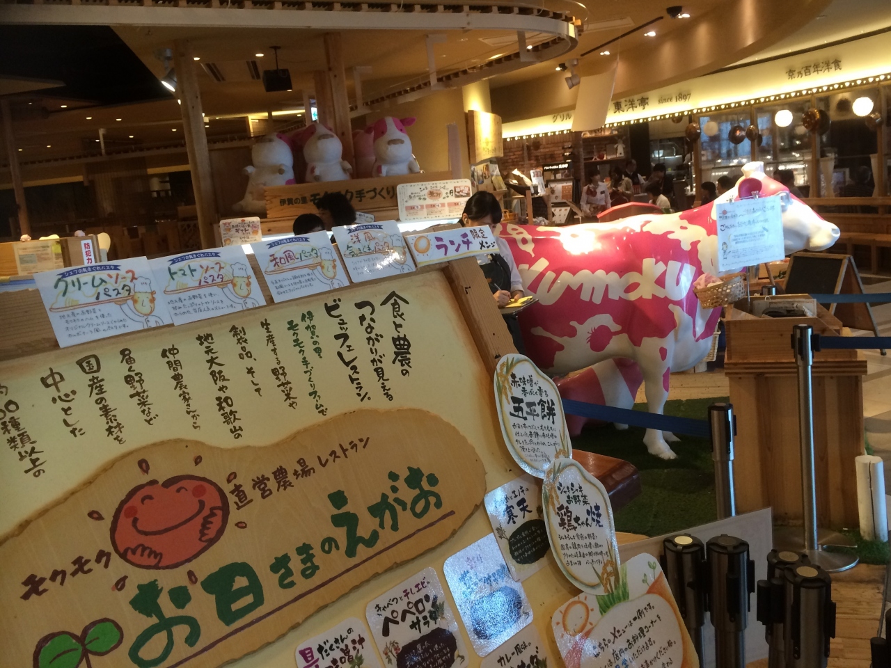 自然食ビュッフェ「モクモク直営農場レストラン」 お日さまのえがおというちょっと変わった名前でしたが、きっと自然がいっぱいの農場で育った野菜たちなのでしょうと思って、入ってみました。