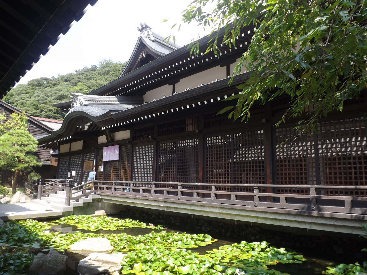 四所神社を参拝してから御所の湯(ごしょのゆ)に入湯しました。南北朝時代の歴史物語に後堀河天皇の御姉安嘉門院の入湯が書かれていたので御所の湯と呼ばれているそうです。しかし、本当に立派な建造物です。立派すぎて温泉には見えません。歴史的建造物で通りそうです。あとで聞いた話しですが、京都の御所をまねて造られたようです。立派なはずです。ここで気にいったのは三段になった滝が流れ落ちる感じが良かったです。