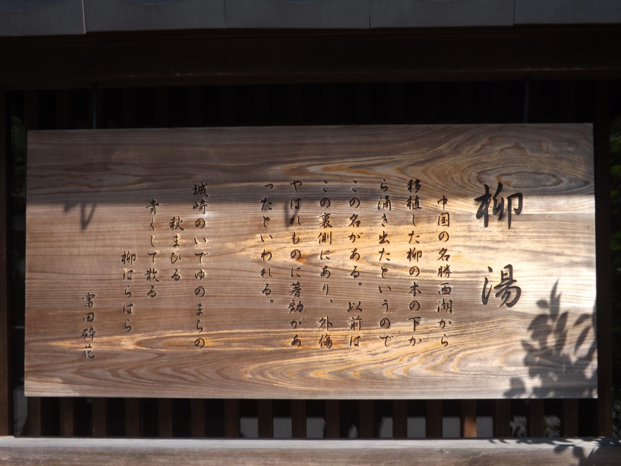 一の湯の次は御所の湯ですが、入湯しなくても近くにある外湯で見れる所は外だけでも見学しようとすこし歩きました。まずあったのが、柳湯(やなぎゆ)でした。中国杭州の名勝である西湖(せいこ)から移植した柳の木の下から温泉が湧き出たそうで、ネーミングの由来になっているそうです。子授安産・子授けの湯とも言われているようで、御利益があるのでしょう。建物自体がレトロな感じなので写真スポットとしても良さそうです。